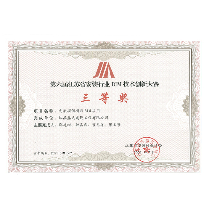 Third prize of BIM Technology Innovation Competition in Jiangsu installation industry